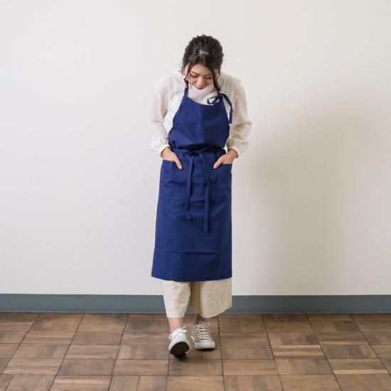 飽きのこないシンプルスタイルなエプロン。パンツスタイルにもスカートスタイルにもグッドマッチ